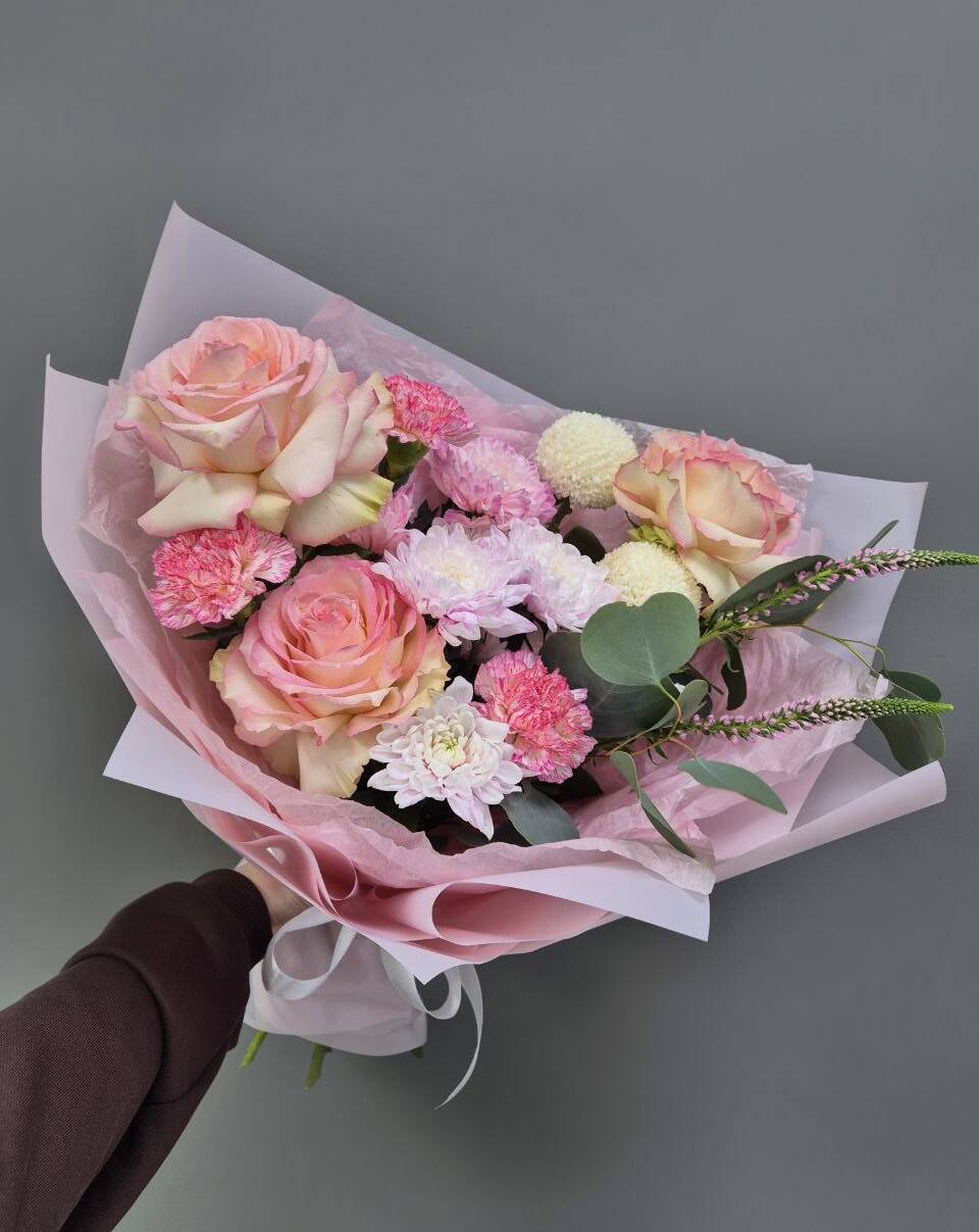 Состав букета: Кустовая хризантема, роза, гвоздика, декоративная зелень, оформление. Флористы могут варьировать состав в зависимости от сезона и наличия цветов, сохраняя стиль и цветовую гамму.