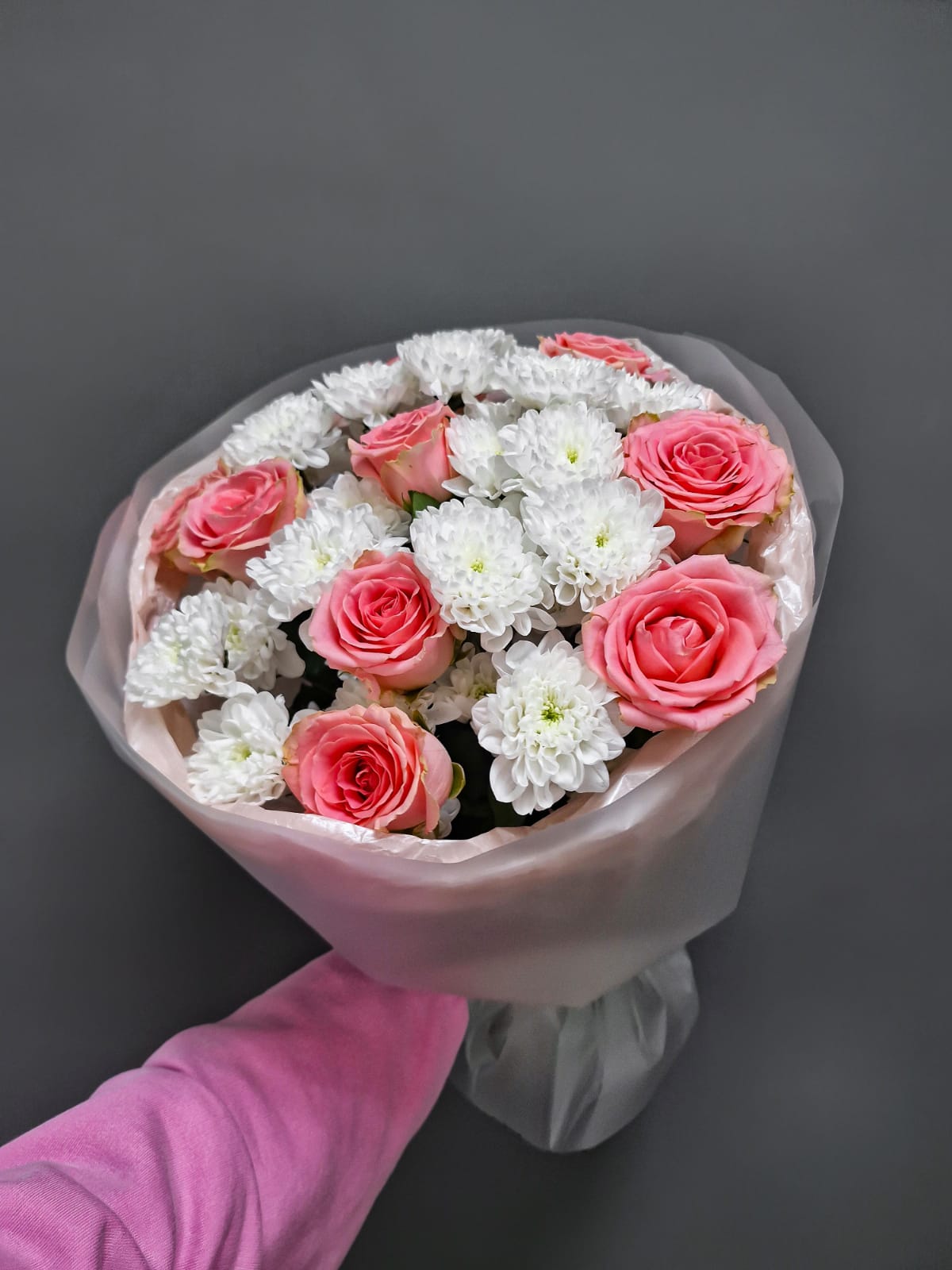 Состав: хризантема кустовая, роза, оформление.