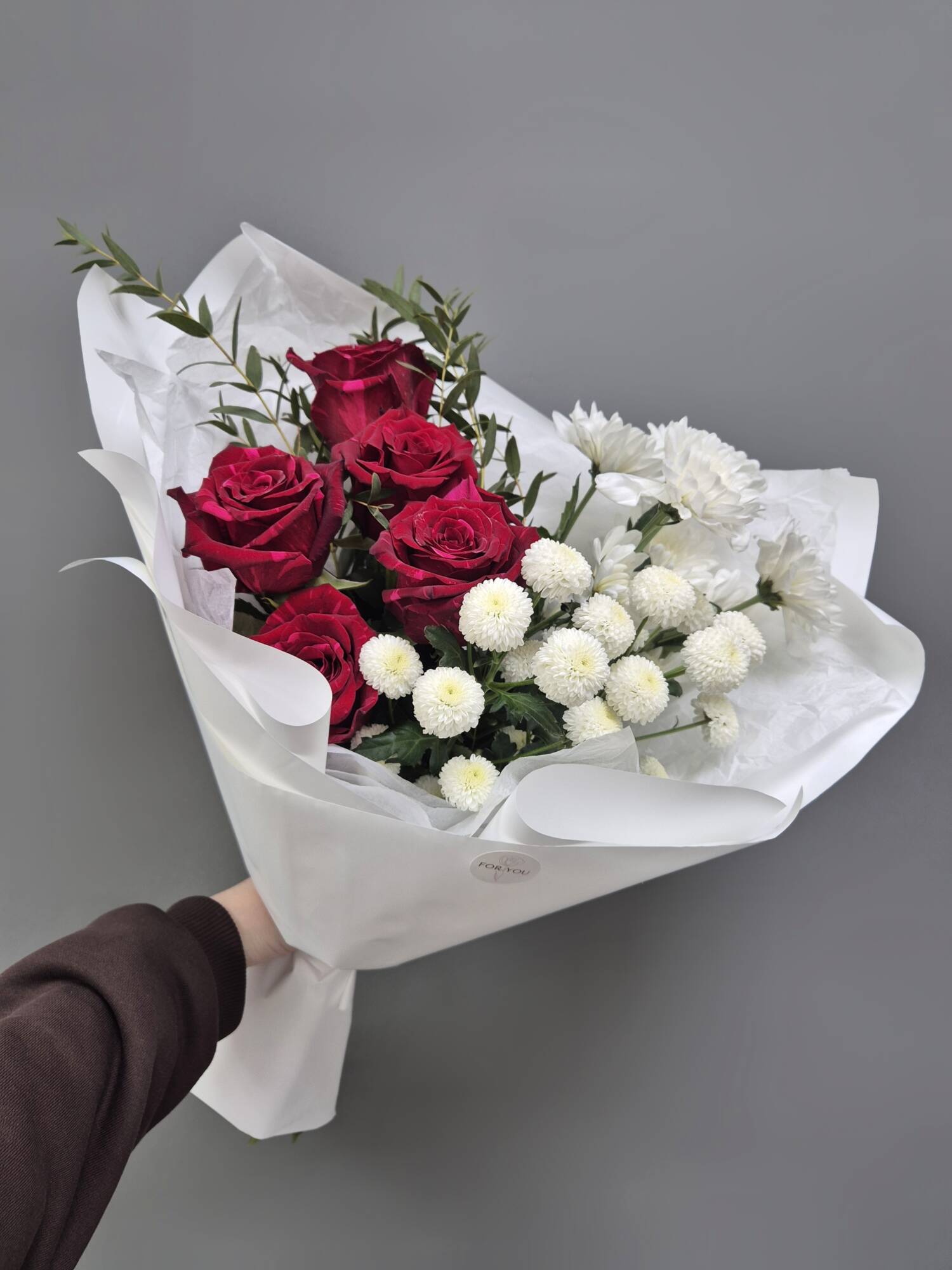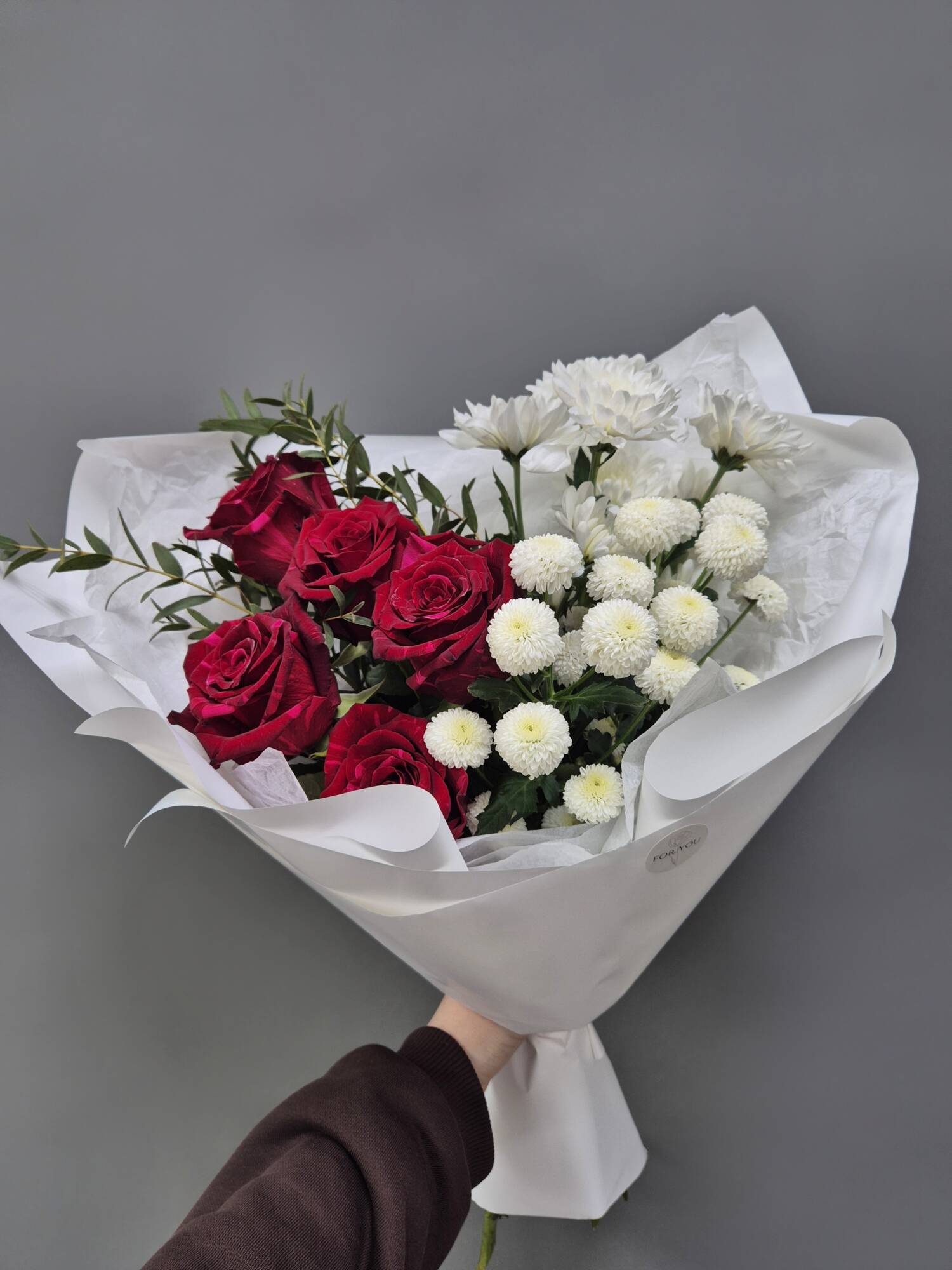 Состав: хризантема кустовая, роза, зелень, оформление.