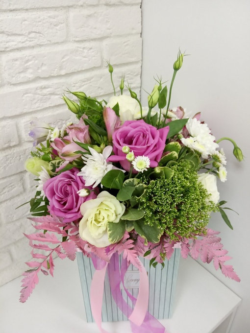 Состав: розы Эквадор, хризантемы, эустомы, альстромерии, зелень (папаротник, трахелиум, питтоспорум), прямоугольная коробка, ленты.