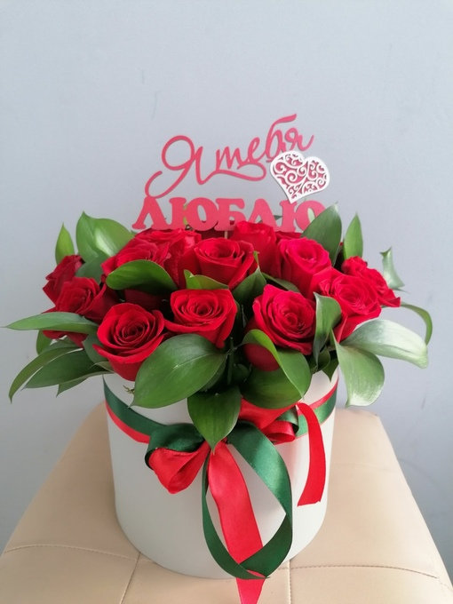Состав: розы Эквадор, зелень (рускус), шляпная коробка, ленты, топпер.