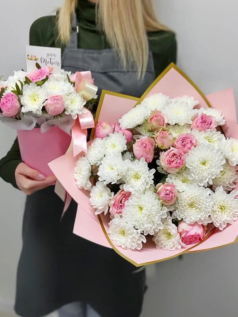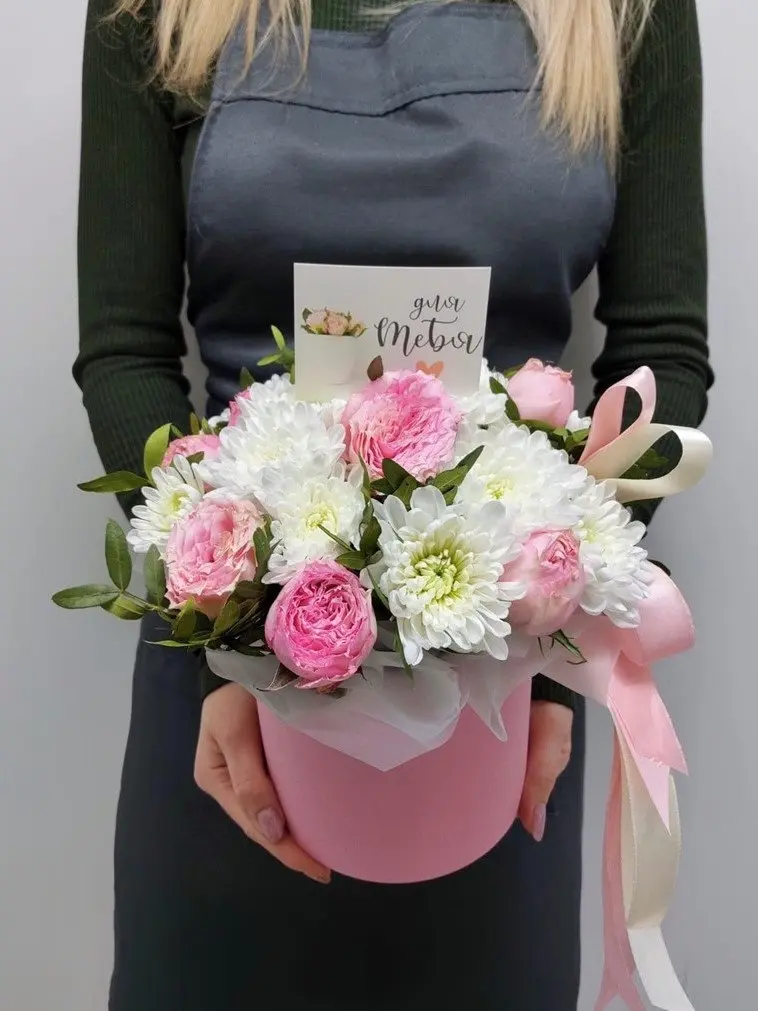 Композиция «Розовая нежность» — это трогательное воплощение невинности, романтики и изысканного вкуса. Нежные кустовые розы и пышные хризантемы в пастельных розовых тонах собраны вручную в элегантной шляпной коробке, дополненной декоративной зеленью фисташки. Опытный флорист создает эту композицию по спиральной технологии с соблюдением законов гармонии, что гарантирует ее безупречный вид и долгую свежесть.