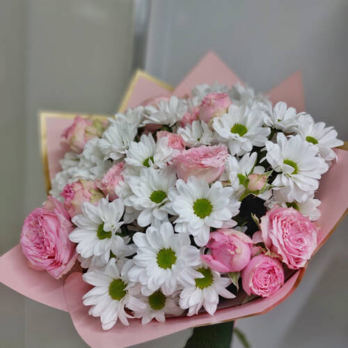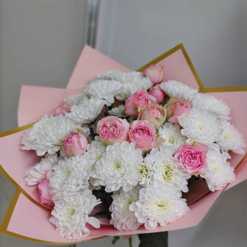 Этот очаровательный и недорогой букет — идеальное сочетание нежности и пышности для любого душевного подарка. Композиция собрана из свежих кустовых роз и воздушных кустовых хризантем, которые создают ощущение тепла, заботы и искренней симпатии. Каждый цветок отобран для долгой свежести, а опытный флорист собирает букет вручную, чтобы он долго радовал глаз.