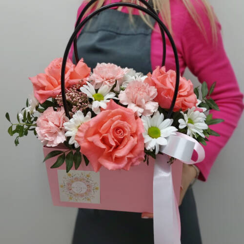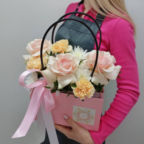 Состав: роза эквадор, гвоздика, хризантема кустовая, зелень, сумочка, оформление